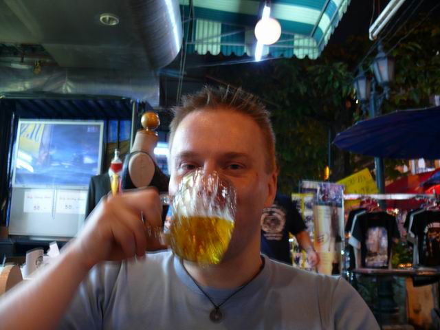 Nach der abendlichen Ankunft in Bangkok gibt’s erst mal das erste Beer Chang in einer kleinen Parallelstraße zur Khao San, der Party- und Rucksackreisendenecke in Bangkok.