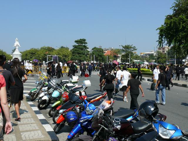 Wenn mindestens 100.000 königstreue Thai alle vom Königspalast nach Hause wollen, und das Hotel gerade mal 300 Meter vom Palast entfernt ist, sollte man sich überlegen, ob man dann nach Ende der Veranstaltung ein Taxi bekommt – Sylvester in Köln läßt grüßen (auch wenn der Anlaß ein ganz anderer ist).