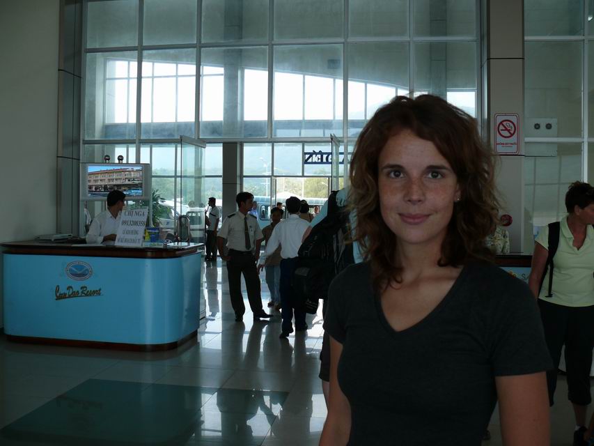 Con Dao ist vom Tourismus noch annähernd unberührt. Ein großes Luxus-Resort ist zwar im Bau, bislang gibt es jedoch nur drei Hotel, die alle drei mit Schaltern in der Ankunftshalle des winzigen Flughafens vertreten sind (im Hintergrund sichtbar).